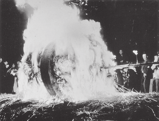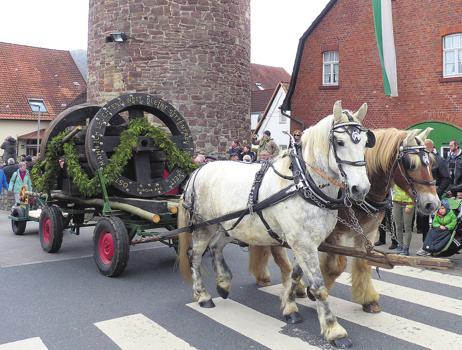 Lügde. Jedes Jahr kommen sechs Räder zum Einsatz, die mit speziellem Roggenstroh, das besonders lang sein muss, gestopft sind, dann entzündet werden und von starken Männern, den Dechen, angeschoben und zum Rollen gebracht werden. Ein Rad wiegt rund 280 Kilogramm, ist seit Generationen 1,70 Meter hoch und besteht aus 4 Lagen Holz mit einer Breite von etwa 30 Zentimetern.