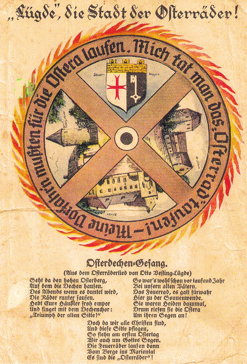 Selbst in den Jahren des Ersten Weltkriegs ließen die Lügder Bürgerinnen und Bürger die Räder ins Tal rollen. Und auch die Vereinnahmung des Osterräderlaufs durch die Nationalsozialisten konnten die Lügder Dechen überstehen. Die initiierten zwar gleich 1934 eine Tausendjahrfeier und reklamierten den Brauch für sich als „unverfälscht germanisch“. Sie machten die Rechnung aber ohne die Dechen, die in einer Nacht und Nebelaktion ein weithin sichtbares Kreuz aufstellten. Das Foto, auf dem die meisten der subversiven Erbauer an ihrem Kreuz zu sehen sind, ist auch heute noch Sinnbild für die Standhaftigkeit der Dechen.