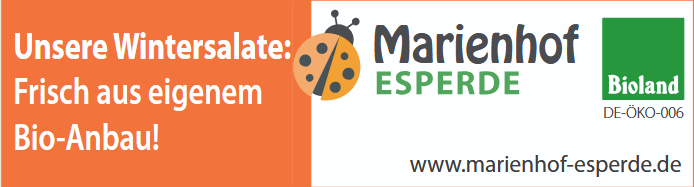 Wenn der Winter langsam zu Ende geht und die Tage wieder länger werden, freut sich der Körper auf frisches Obst und Gemüse. „Fünf Portionen und vorzugsweise in Form von Rohkost sollte jeder täglich davon verzehren“, rät Sabine Zeller vom Marienhof Esperde. Auch im Winter erntet der Marienhof frischen Salat. „Sie können also derzeit regionalen Salat essen!“, erklärt die Gärtnermeisterin. Und zwar besonders knackig-geschmackvollen.