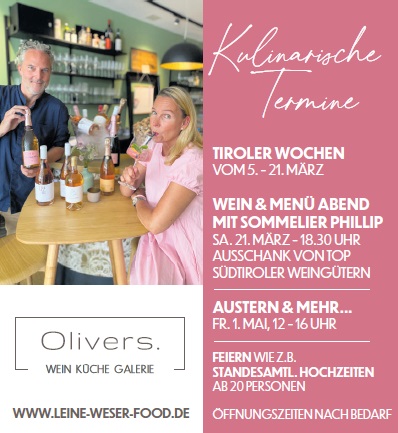 Was im Übrigen auch fürs Olivers gilt: Gerade aus der Winterpause zurückgekehrt, heißt es hier jetzt wieder „Wein – Küche – Galerie“. Erlesene Weine, köstliche Speisen und handverlesene Kunstwerke – im Herzen von Hameln vereint das Olivers Genuss und Kultur in entspannter Eleganz. Ein Ort für Menschen mit Sinn für das Echte, das Gute und das Schöne. Dies übrigens unter einem bestimmten Motto: Leine Weser Food! Es steht für ein gastronomisches Konzept, das den Charakter der Region mit einem feinen Gespür für Qualität und Nachhaltigkeit vereint. Hier verschmelzen moderne Genusskultur und ländliche Verwurzelung zu einem stilvollen Erlebnis.
