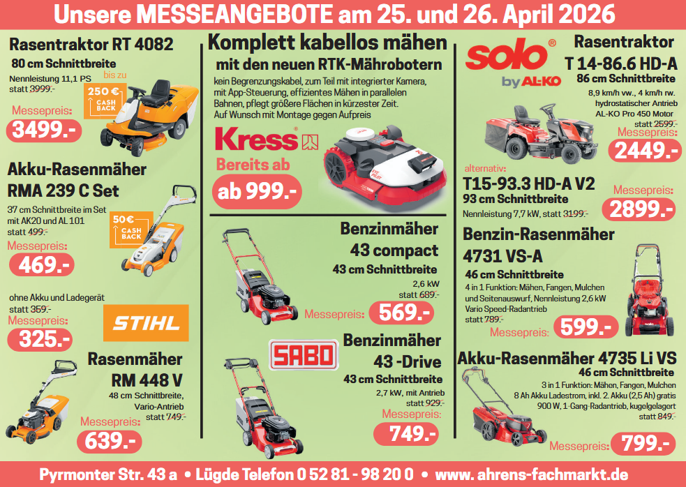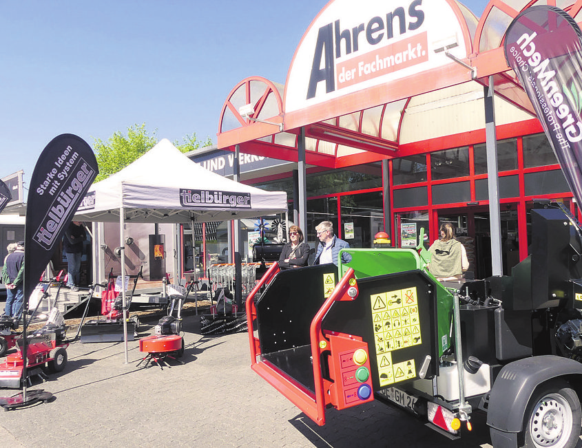 Der Fachmarkt Ahrens zeigt Gartengeräte von der Motorsäge über kleine Rasenmäher bis zum großen Rasentraktor der Marken Stihl, Solo-AL-KO, Sabo, Kress und anderen. Dieses Jahr erstmals im Sortiment: die Marken HUSQVARNA und KUBOTA. Für die vollautomatische Pflege des Rasens bietet das Unternehmen zudem einen Komplettservice vom Verkauf über Installation und Wartung verschiedener Mähroboter an. Hier werden sowohl Modelle für den kleinen Vorgarten als auch für bis zu 5000 Quadratmeter große Parkanlagen mit unterschiedlichen Steigungen gezeigt. Für Geräte im Bereich der Reinigungstechnik von Kärcher bietet Ahrens die optimale Beratung und auch einen mobilen Reparaturservice an.