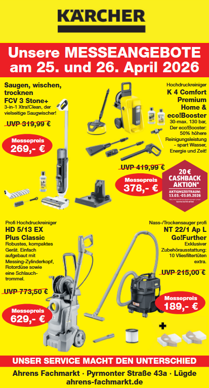 Interessierte können an beiden Tagen Geräte direkt testen und sich Profitipps von den Werksberatern geben lassen. Am Standort an der Pyrmonter Straße konnte Ahrens wieder ein breit gefächertes Ausstellerfeld dazugewinnen, welches das hauseigene Angebot um Themen wie Mobilität, Gartenbau und Energie ergänzt. So zeigen Automobilhändler aktuelle Pkw- und Wohnmobilmodelle, während Fahrradexperten neueste E-Bike-Trends vorstellen. Wer kreative Impulse für seinen Garten benötigt, bekommt spannende Anregungen mit viel Liebe zum Detail und einem besonderen Auge fürs Pflanzen. Kärcher präsentiert Reinigungstechnik zum Anfassen sowohl für den Privatier als auch für die professionelle Anwendung. Auch rund ums Thema Energie und nachhaltiges Heizen wird viel geboten: Zwei führende Hersteller moderner Ofensysteme geben Einblicke in innovative Wärmelösungen.