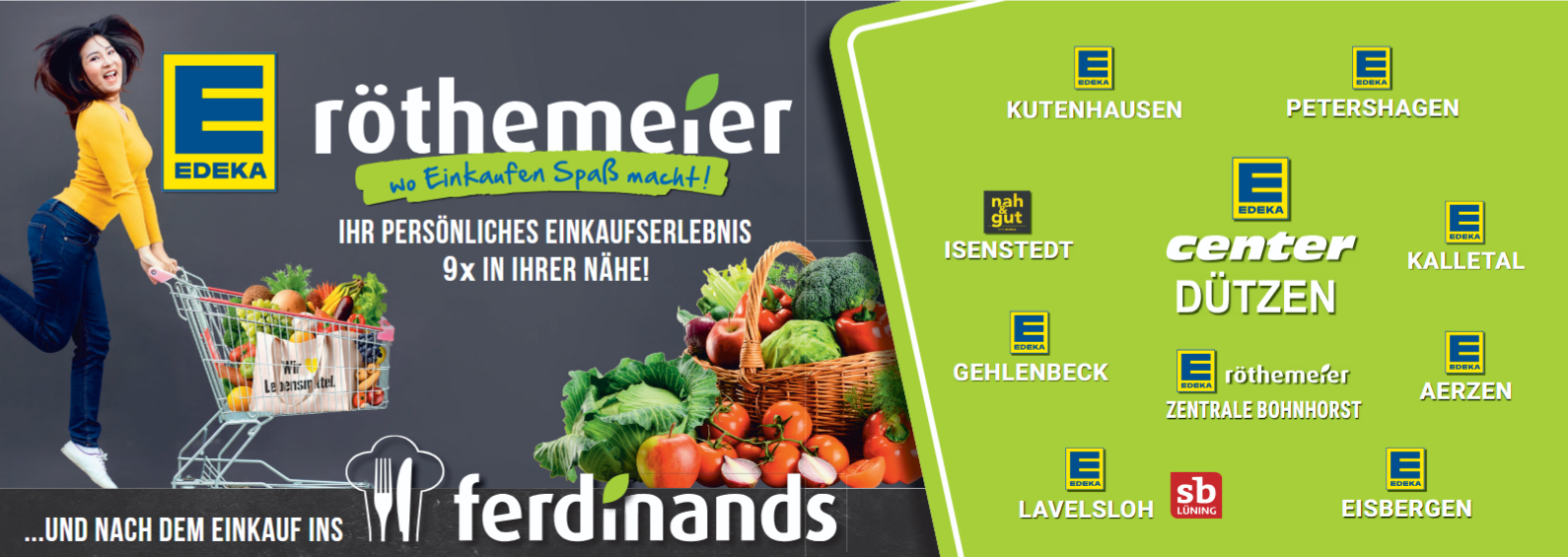 Als Vollsortimenter bietet Röthemeier in faszinierender Vielfalt alles für den täglichen Bedarf – und das mit einer vorbildlichen Palette regionaler Angebote. So gehören neben dem umfangreichen Lebensmittelsortiment, neben dem Frischecenter (Salate, Desserts und Feinkost aus eigener Produktion), neben Fleischerei und Fischtheke, neben der beeindruckenden Obst- & Gemüseauswahl und der Vitaminbox sowie Salatbar, neben der großen mit besonderen Spezialitäten gespickten Getränke-Abteilung und neben dem Non-Food-Bereich mit Haushaltsgeräten, Schreibwaren, Zeitschriften auch eine Post- und DHL-Filiale sowie eine Toto- und Lotto-Annahmestelle dazu. Und das alles krönt „Ferdinand“: Er steht für ein gastronomisches Konzept mit Bäckerei, Bistro und Restaurant mit 60 Plätzen, in dem Kaffee-, Back- und Kuchenspezialitäten sowie leckere Snacks und von 11.30 bis 14 Uhr ein täglich wechselndes Mittagsgericht angeboten werden. „Ferdinand“, dessen Name zurückgeht auf Firmengründer Ferdinand Röthemeier, ist, so Manuel Sasse, Ausdruck dafür, wie gut der neue Markt angenommen wird.