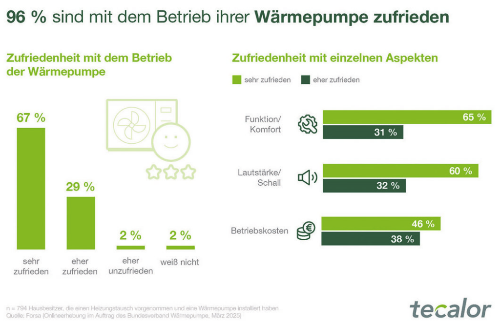 Dass sich diese Effizienz im Alltag bewährt, zeigt eine aktuelle Umfrage des Meinungs- und Marktforschungsinstituts forsa im Auftrag des Bundesverbands Wärmepumpe: 67 Prozent der befragten Hausbesitzer mit Wärmepumpe sind mit dem Betrieb ihrer Anlage sehr zufrieden, weitere 29 Prozent eher zufrieden – insgesamt ergibt das 96 Prozent. Und genauso viele würden sich auch rückblickend wieder für eine Wärmepumpe entscheiden. Besonders geschätzt werden dabei Funktion und Komfort (96 Prozent), die geringen Geräuschpegel (92 Prozent) sowie die niedrigen Betriebskosten (84 Prozent).